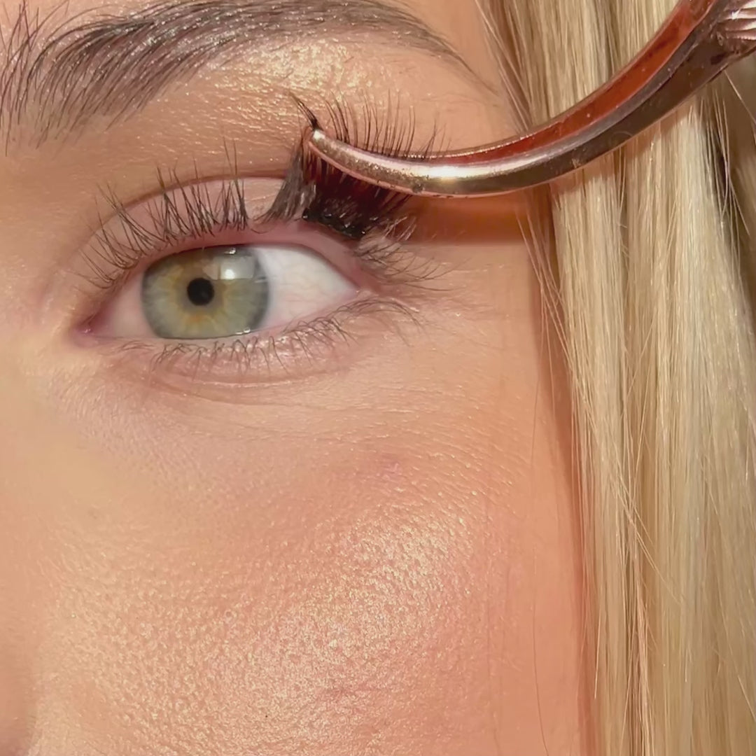 Brug en pincet og placér hver cluster under dine naturlige vipper, tæt på vippekanten – ikke direkte på huden.